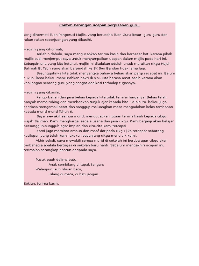 karangan upsr-ucapan from imgv2-1-f.scribdassets.com Biasanya pidato perpisahan ini berisi mengenai ucapan terima kasih, ucapan maaf atau bahkan sebuah wasiat/nasihat. Sebagai rujukan ini adalah contoh ucapan perpisahan untuk guru. Perpisahan dari guru untuk siswa. Pidato perpisahan sekolah bahasa inggris terbaru text sumber. Contoh karangan ucapan perpisahan guru sumber : Terima kasih saya ucapkan atas kepercayaan kepada saya untuk mewakili rakan rakan. Bagi sebagian orang ucapan perpisahan terasa menyakitkan apabila diucapakan pada orang yang mereka sayangi serta kasihi. Contoh karangan ucapan perpisahan guru.