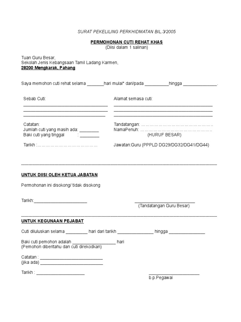 Trainees2013: Borang Cuti Rehat Khas Kpm from reader012.vdokumen.net Pekeliling cuti rehat khas crk 10 hari medium perkongsian bestari warga pendidikan malaysia. For more information and source, see on this link : Pekeliling cuti rehat khas crk 10 hari sumber pendidikan. Seperti yang telah dibentangkan melalui bajet 2018 pada oktober 2017 yang lalu, mulai tahun 2018, cuti rehat khas atau crk akan ditambah menjadi 10 hari daripada 7 hari. Kadar kelayakan cuti rehat tahunan bagi pegawai perkhidmatan awam persekutuan mulai 1 januari 2016 layanlah berita terkini tips berguna maklumat. Rehat, cuti rehat khas atau cuti tanpa gaji atas urusan persendirian, tertakluk pada kelayakan cuti pegawai; Bilangan maksimum cuti rehat yang dibenarkan untuk tujuan pemberian wang tunai di bawah spp 17/2008 bagi sesuatu kontrak adalah sebanyak lapan (8) hari atau satu per empat (1/4) daripada kadar cuti rehat untuk setahun, mengikut mana yang lebih rendah. Cuti tanpa gaji 10 d.